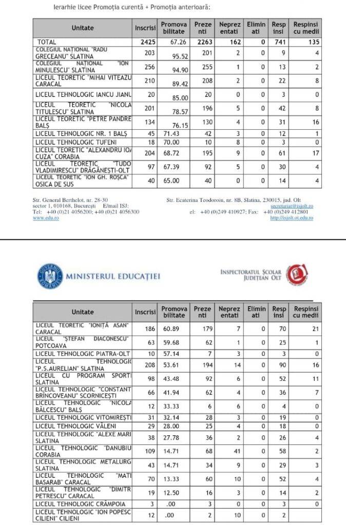 Cele mai bune rezultate au fost înregistrate la Colegiul Național „Radu Greceanu” Slatina, cu o promovabilitate de 95,52 la sută, și Colegiul Național „Ion Minulescu” Slatina, promovabilitate de 94,90 la sută. Liceul Teoretic „Mihai Viteazul” Caracal este pe locul al treilea, cu o promovabilitate de 89,42 la sută.